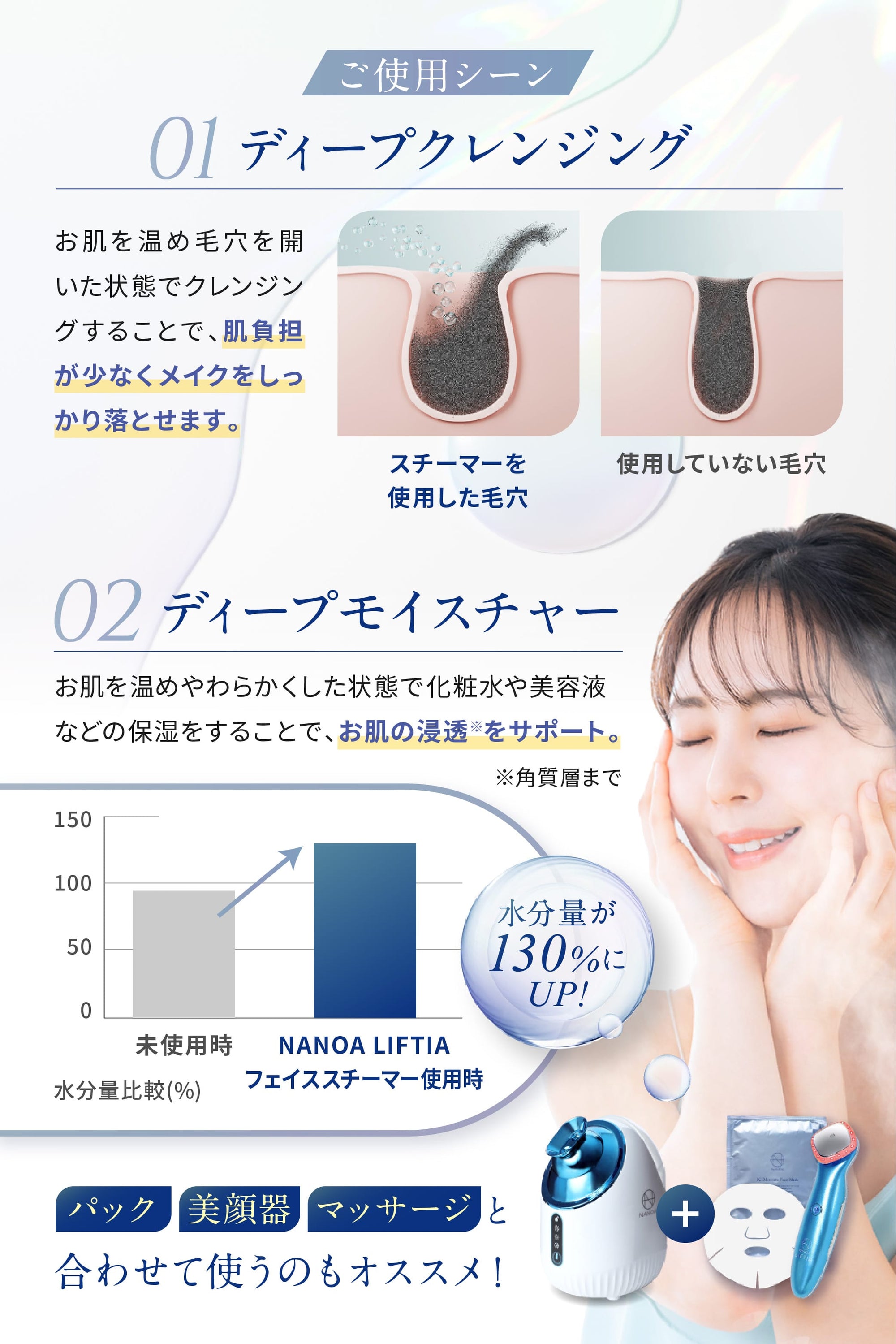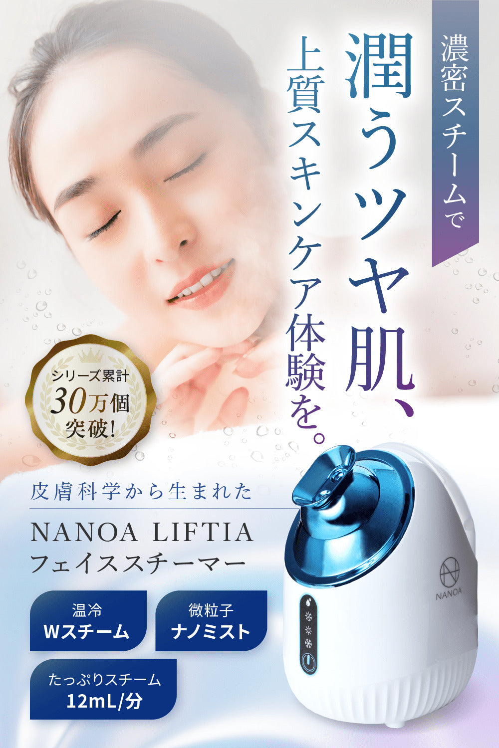 「潤うツヤ肌、上質スキンケア体験を。」NANOAリフティア フェイススチーマーは、乾燥肌・混合肌・ゆらぎ肌が気になる方のために、美容皮膚科医と共同開発したプレミアムフェイススチーマーです。