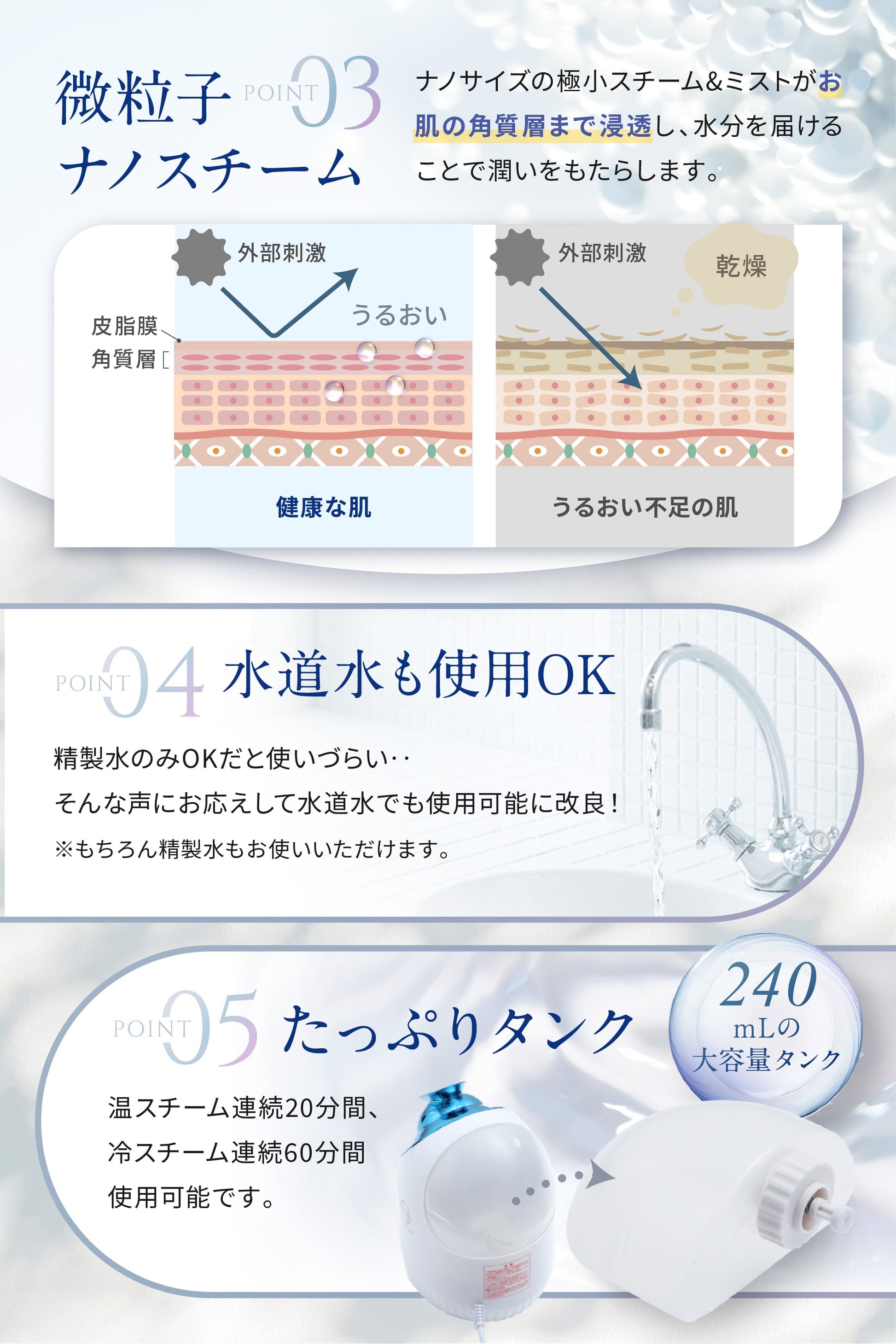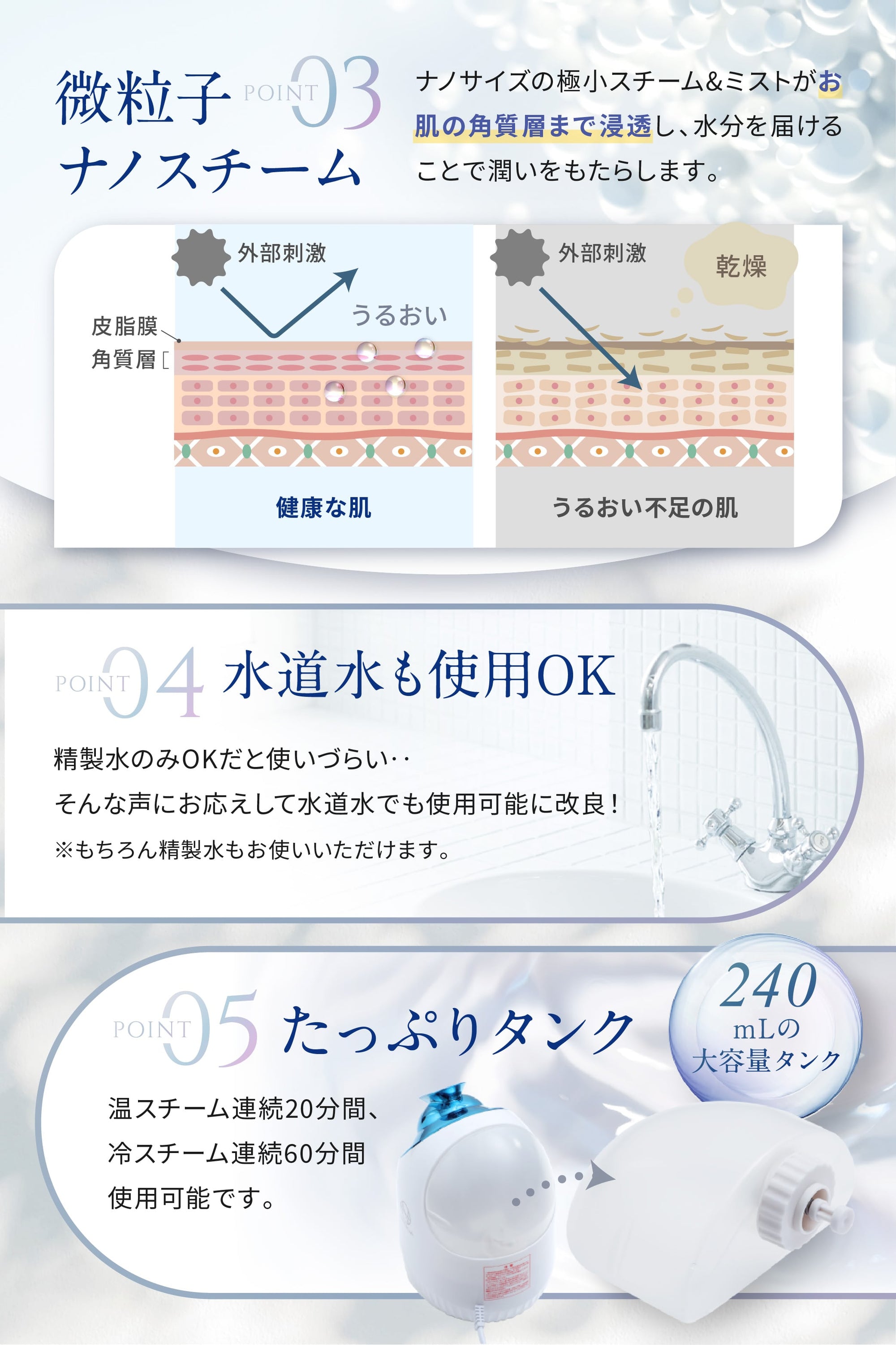 ナノサイズの極小スチームが角質層まで浸透し、水分を届けます。水道水の使用も可能。240mLの大容量タンクで約20分間の連続使用ができます。
