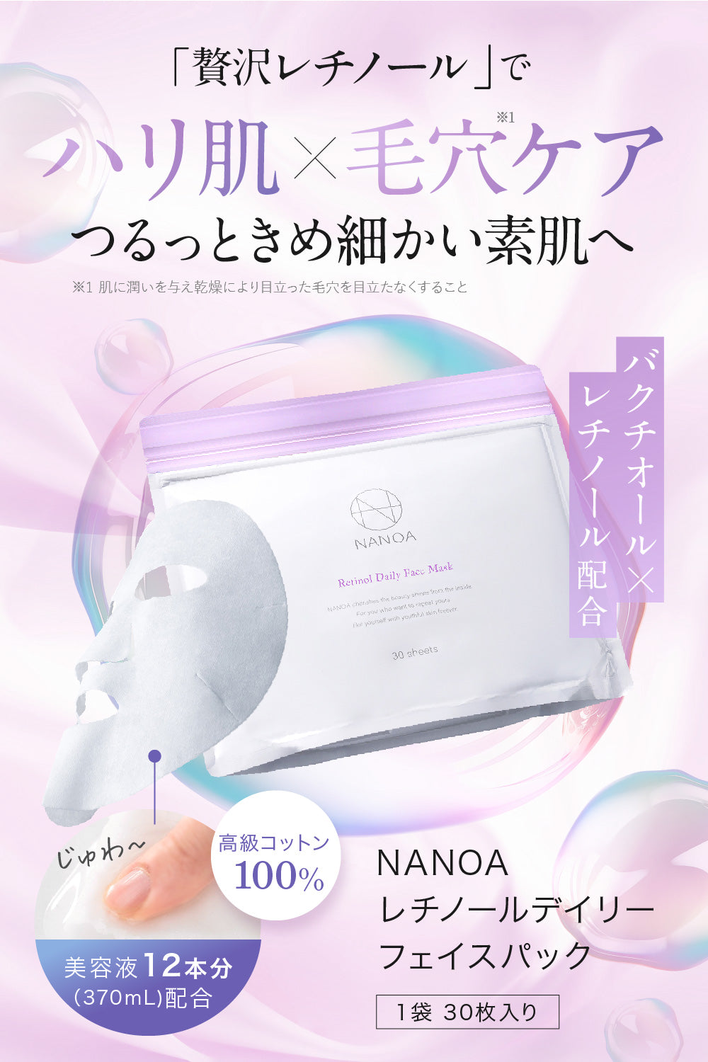 1袋あたり美容液12本分(370mL)をたっぷり配合。うるおい溢れるシートがお肌にピタッと密着します。さらに、フラーレン、ヒアルロン酸、コラーゲン、セラミド、マリンプラセンタを配合し、NANOAは理想的な保湿力にこだわりました。